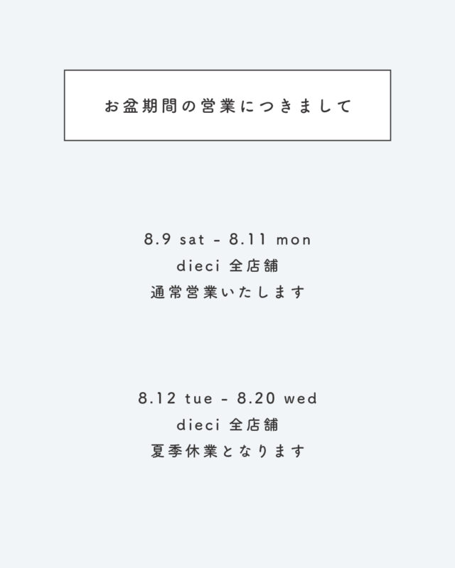 dieci各店舗は、下記の日程で夏季休業をいただきます。