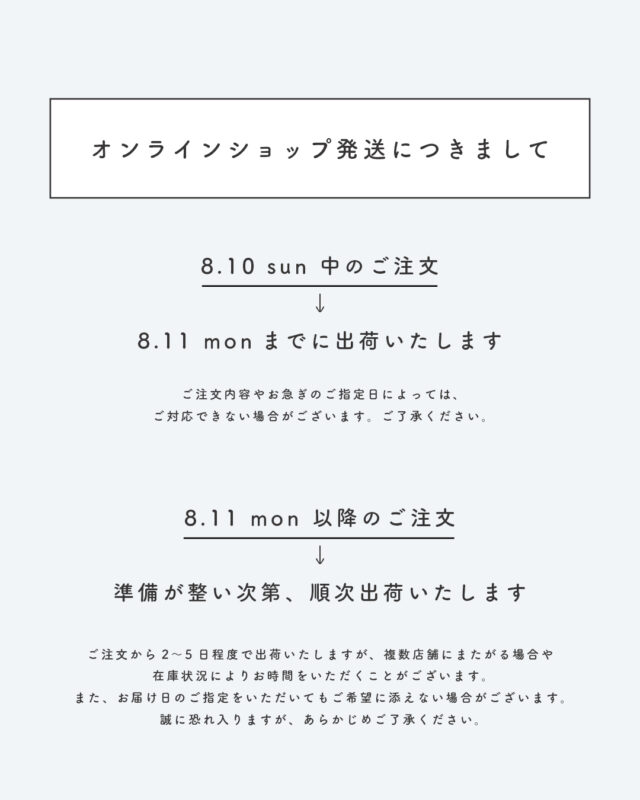 夏季休業に伴うオンラインショップの発送は以下の通りです。