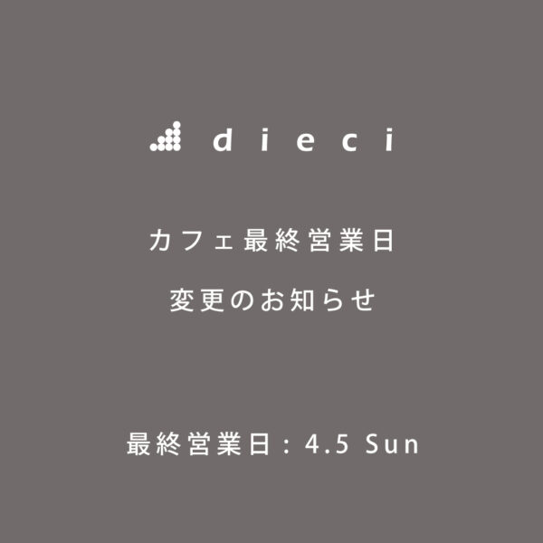 カフェ休業のお知らせ 日頃よりdieci各店舗をご利用いただき、誠にありがとうございます。 このたび、1999年のオープン以来26年間営業してまいりました天神橋店2階のカフェを、休業させていただくこととなりました。 dieciの「食の場」「憩いの場」として、長きにわたり皆さまに可愛がっていただき、たくさんの思い出を重ねてきた場所。その歴史をここで止めることは本当に辛く、苦渋の決断ではありましたが、自分たちなりに思い描いてきた“カフェとしての役割”をひとつ終える時期ではないかと考え、今回の決断に至りました。 これまでdieciのカフェに関わってくださったすべての皆さまに、心より感謝申し上げます。右も左も分からなかった私たちが、ここまで続けてこられたのは皆さまのおかげです。 そして何より、数あるカフェの中からdieciを選び、ご来店くださったお客様へ。長きにわたり温かく支えていただき、本当にありがとうございました。 今後はキッチン付きのイベントスペースとして、カフェという形にとらわれることなく、より自由な切り口でdieciの魅力を表現してまいります。また、期間限定の飲食イベントやポップアップなども開催できればと考えております。これまでとは少し違ったかたちで、この場所の新たな可能性を育んでいけたら幸いです。 これからもdieciとしての歩みは続きます。引き続きご愛顧のほど、何卒よろしくお願い申し上げます。 最終営業日は4月12日(日)です。 残りわずかな時間ではございますが、最後までどうぞよろしくお願いいたします。 株式会社dieci 田丸祥一 堀あづさ