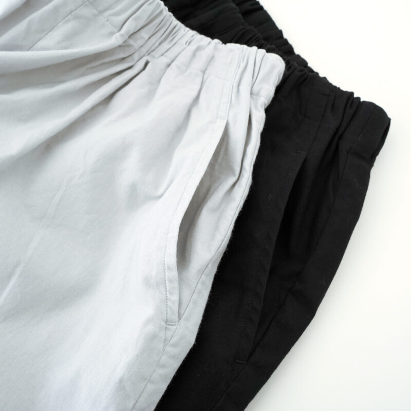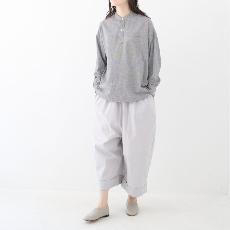 平織りしたコットンリネンガーゼを使用しており、ふんわりと柔らかく、通気性を確保しながらも、透け感を気にすることなくご着用いただけます。どちらもゆったりとリラックスした着心地を楽しみながら、大人カジュアルな印象になる一着です。