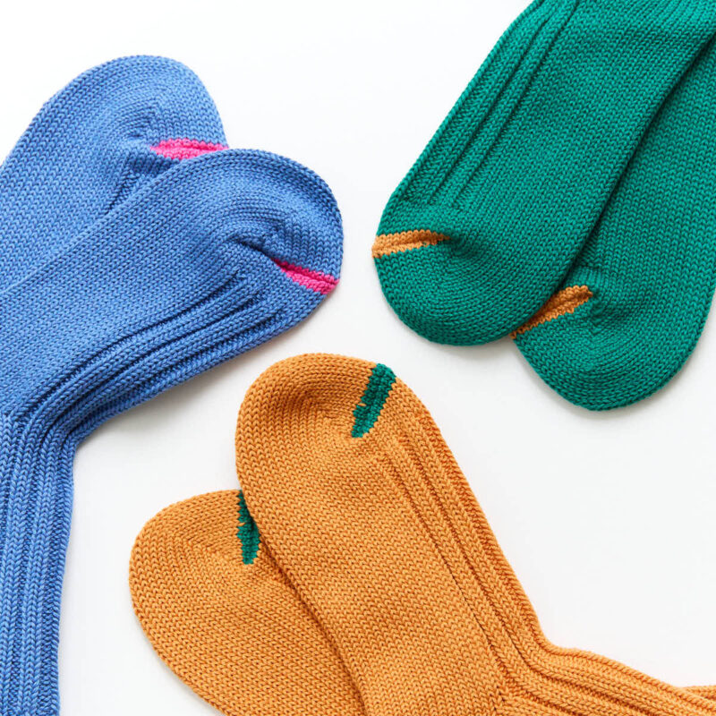 こちらは、80年代や90年代のアウトドアウェアのカラーリングからインスピレーションを受けて生まれた「CHUNKY RIBBED CREW SOCKS」です。一般的なソックスに比べてしっかりとした肉厚の生地ながら、編み目が大きいため通気性に優れています。