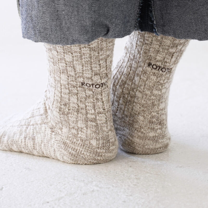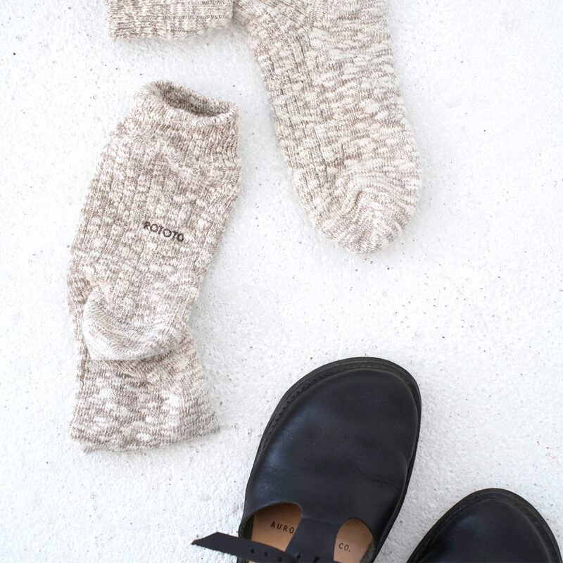 ROTOTOの靴下は、「一生愛せる消耗品をつくる」という哲学のもと、素材や編み方、履き心地に徹底してこだわっています。素材本来の心地よさを最大限に引き出した靴下は、履きこむほどに足に馴染み、相棒のような存在になります。
