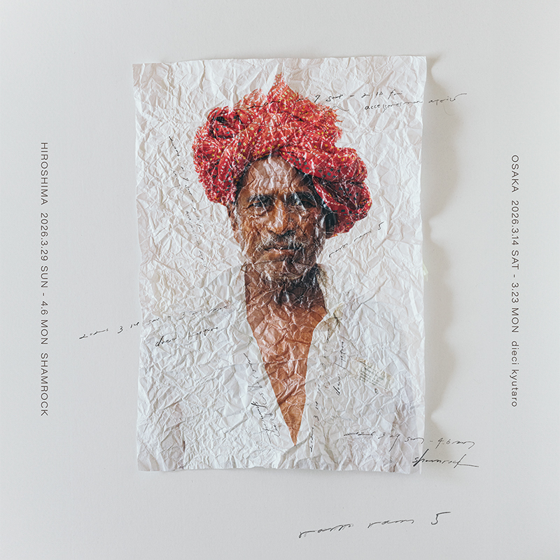 RAMRAM 5 桑原雷太 2026.3.14 sat - 3.23 mon 紙を手で強くギュッと丸め、それをまた丁寧に広げていく。 そのくしゃくしゃになった紙の中で、インドの男のポートレートがいつもより血が通っているように感じられた。 インドでターバンを巻いているのは年かさの人が殆ど。 彼らの顔には長い月日を表す深い皺が刻みこまれている。 そして彼らが頭に巻くターバンは、カラフルな布が幾重にも重ねれられた、多層的で複雑なもの。 そのターバンを巻いた男の顔が、皺になった紙と不思議な一体感を醸していることに気づき、とても美しく感じた。 そして今回の展示の形が見えてきた。 インド北部のラジャスタン州にある小さな街、ブンディに通い続けている。 はじめは旅行者として、それがいつからか撮影をするために訪れるようになった。 理由はひとつ、ブンディにはターバンを巻いた男たちが多いからだ。 初めて訪れた時から、彼らの姿を撮ることに飽きることなく夢中になっていて、気づけば10年以上毎年のように訪れている。 彼らの多くは年かさのいった農夫で、顔には長年太陽を浴びてきたからか深い皺が刻まれ、ひょろりと細い身体に白一色の衣装を纏っている。 その姿と対照的なほど鮮やかな色とりどりのターバンが彼らの頭に巻かれているさまは、目を引く美しさがあり、いつも心踊らされてきた。 そんな彼らの写真を撮ることは、日本にはない非日常や、決定的瞬間をそのまま記録するためではない。 その美しさを最大限に写真に表現するため、白い背景を現地に持ち込み、撮影。 それはターバンの男たちに対峙したときの感動を視覚化する試みでもある。 RAMRAM( ラムラム)とは、インドの神の愛称で、北インドではその名前を呼ぶことが、人と人との接点をつなぐ日常の挨拶になっている。私自身も、彼らを撮影するときにその言葉を口にしてから撮影に臨んでいる。 同テーマでの展示は今回で5回目。 桑原雷太 ( kuwahara raita ) 大阪市生まれ・在住 世界を旅するなかで写真に出会う。 毎年作品を撮るために世界のどこかへ旅に出ることを続けている ———————————— 3/14 ・15・ 16・ 23の4日間の終日、3/19は14時より桑原さんがご在廊予定です。 また、3/14 ・15・ 16・ 23はポートレート撮影イベントも開催予定です。 ポートレート撮影は事前予約制とし、本日3/6(金)20時より予約の受付を開始します。 dieci kyutaro 〒541-0056 大阪市中央区久太郎町2-4-13 Open 12:00-19:00/11:00-18:00(日祝) Close 火水 Tel 06-4256-4485 堺筋本町駅 11番出口徒歩2分 |